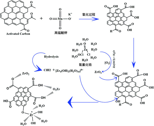 圖1:載鋯活性炭合成過(guò)程中可能發(fā)生的改性過(guò)程示意圖。