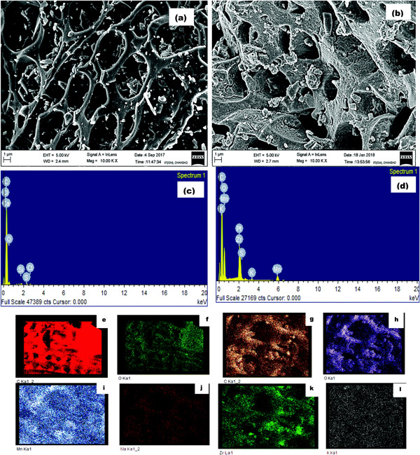 同時(shí),EDX結(jié)果也證實(shí)了用KMnO 4和氯氧化鋯的氧化過(guò)程顯著增加了載鋯活性炭上的氧部分。元素組成結(jié)果要求Zr金屬元素在碳表面上的含浸量為14%。其他氧化元素的存在,即氧氣和錳也證實(shí)了載鋯活性炭?jī)?nèi)在的氧化活性。在改性過(guò)程中,與未加工的活性炭相比,氧部分變成了兩倍以上,而活性炭對(duì)于應(yīng)用部分則顯示出良好的征兆。因此,F(xiàn)E-SEM和EDX映射的結(jié)果聯(lián)合顯示,這種改性將原始活性炭的結(jié)構(gòu)模式改變?yōu)榫哂懈嗫椎母植诘暮醣砻,這將有助于其應(yīng)用。