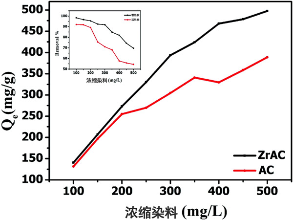 吸附等溫線 已經(jīng)進(jìn)行了初步的批處理實(shí)驗(yàn),以研究新制備的載鋯活性炭的性能并確定其在廢水處理中的可行性。使用活性炭和載鋯活性炭的染料吸附如圖3所示。該圖顯示,隨著濃度從100 mg L -1增加到500 mg L -1,載鋯活性炭對(duì)活性藍(lán)19染料的去除效率更高。同樣,載鋯活性炭的吸附容量也顯示出比活性炭大吸附容量。載鋯活性炭的去除效率和吸附能力的提高主要?dú)w因于較高的氧化功能,該功能很容易從溶液中吸收染料分子。