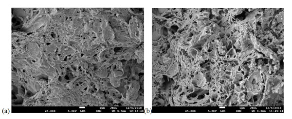 根據(jù)觀察到的活性炭微觀結(jié)構(gòu)來進(jìn)行形態(tài)研究。圖1顯示了在650°C(a)和850°C(b)兩種不同溫度下用25%H3PO4制成的活性炭的比較?梢钥闯,與650℃相比,在850℃下制備的活性炭具有稍大的孔。可以得知孔體積隨著活化溫度的升高而逐漸增加。