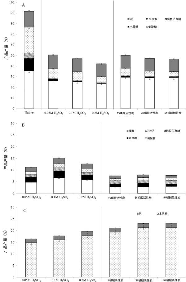 圖2:磷酸加入活性炭的濃度對生物質分離的影響(A)固體部分,(B)含水部分,(C)有機部分。