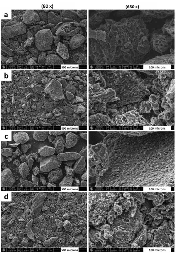 我們使用現(xiàn)代分析技術(shù)來了解制備的活性炭催化劑的真實性質(zhì),掃描電子顯微鏡(SEM)是查看材料形態(tài)的強大工具。圖1顯示了四種活性炭樣品的SEM圖像。圖像是在兩個不同的分辨率,以比較不同比例的樣本。評估不同煅燒溫度的影響是很重要的。圖1的左側(cè)圖像顯示,無論煅燒溫度如何,所有樣品的表面都被各種亞微米大小的顆粒所掩蓋,并且表面上存在許多明顯的解理。不同煅燒溫度下的熱解對活性炭樣品的形貌影響不大,但有輕微的變化,如一些顆粒從表面被去除,一些解理被侵蝕。此外,從這些SEM圖像可以推斷,這些活性炭材料中的許多微孔結(jié)構(gòu)使其成為任何化學反應(yīng)中反應(yīng)物相互作用的極好載體。