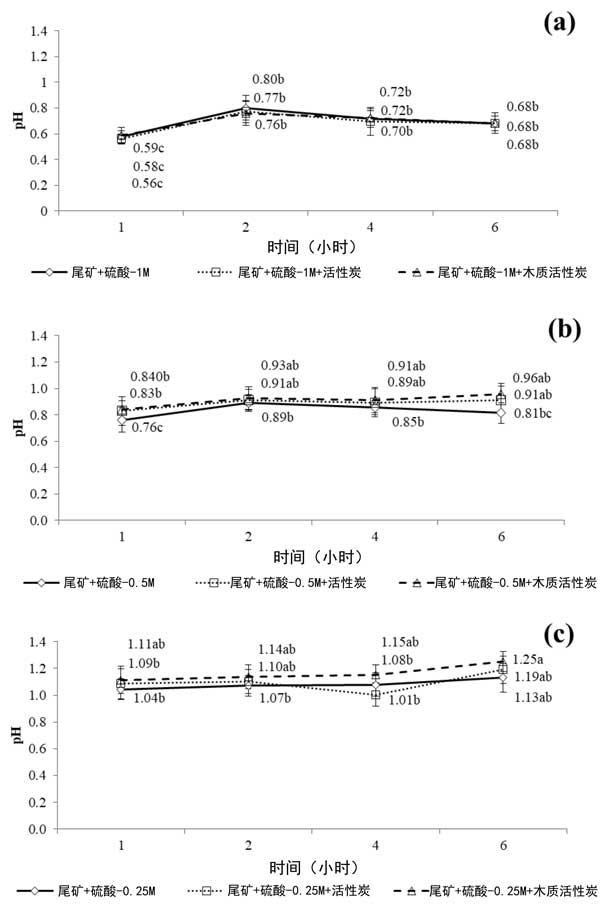 在H2SO4-1M中用活性炭和木質(zhì)活性炭處理的對照尾礦在圖2提供,(3a)中的pH變化,H2SO4-0.5M(3b)和H2SO4-0.25M(3c)浸出溶液。關(guān)于浸出實(shí)驗(yàn)期間的pH演變,盡管活性炭顯示堿性pH,但在不存在或存在活性炭的情況下觀察到小的差異。選擇硫酸作為浸出液是因?yàn)樗梢杂行У剡x擇性溶解Zn化合物而不是Pb和Ca。相反,樣品中的氧化鉛和碳酸鹽會(huì)溶解在硫酸溶液中,然后以硫酸鉛的形式沉淀。然而,當(dāng)在浸出液中加入活性炭時(shí),氧化還原電位的下降幅度高于加入木質(zhì)活性炭后。這一事實(shí)可能與碳基材料與系統(tǒng)中存在的氧化劑種類和礦物質(zhì)之間的不同相互作用有關(guān)。事實(shí)上,觀察到在木質(zhì)活性炭催化的黃銅礦浸出過程中氧化還原電位降低,并將這種影響歸因于礦物和木質(zhì)活性炭在酸性介質(zhì)中的電偶相互作用。