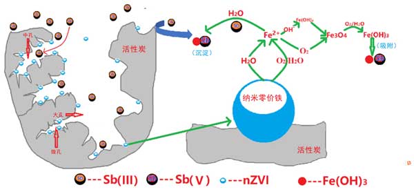 活性炭相對(duì)于納米級(jí)零價(jià)鐵來(lái)說(shuō)吸附銻的效果差很多,但是由于其在多孔結(jié)構(gòu)和機(jī)械強(qiáng)度方面的特性,活性炭可用作支撐材料;钚蕴枯d入納米級(jí)零價(jià)鐵來(lái)進(jìn)行改性處理,可以用于滲透性反應(yīng)屏障,以攔截受污染地下水中的銻或添加到家用過(guò)濾器中以去除銻(III)。