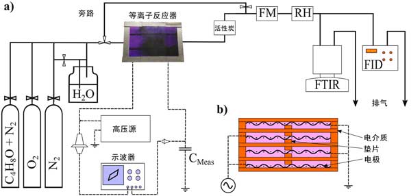 圖1:(a)實(shí)驗(yàn)裝置(b)等離子體反應(yīng)器的示意圖。