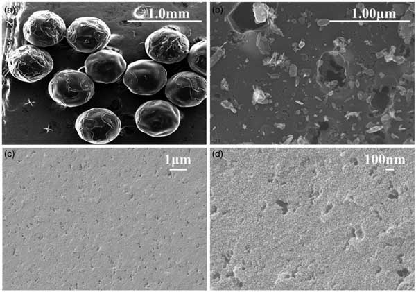 SEM被用于研究活性炭的形態(tài)、表面粗糙度和粒度。其內(nèi)部孔隙結(jié)構(gòu)信息也可以通過橫截面的SEM進行分析。SEM圖像顯示球型活性炭具有均勻的球形,粒徑(直徑)約為600μm(圖1a)。表面比較光滑,有較大的裂紋和孔隙結(jié)構(gòu),表面有許多無序的微晶結(jié)構(gòu)(圖1b)。橫截面顯示了一些分布均勻的相對均勻的孔隙(圖1c和1d)。