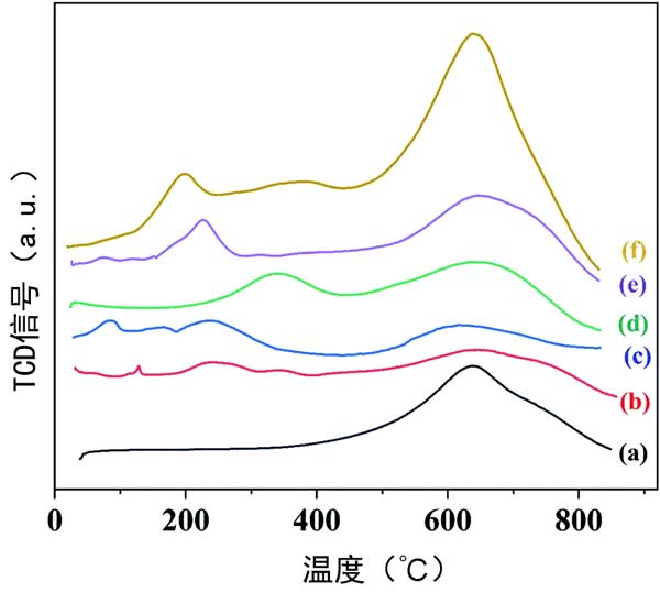 活性炭和載鉑活性炭催化劑的H2-TPR曲線在圖1顯示,它描繪了還原機(jī)制。如圖1a所示,在活性炭的H2-TPR曲線中觀察到630℃的峰,這歸因于活性炭的表面官能團(tuán)。與活性炭相比,活性炭載鉑催化劑的H2-TPR曲線(圖1b)顯示了在240℃和340℃處的峰值,這是由Pt-O-Pt和Pt-O-C的還原產(chǎn)生的,分別進(jìn)一步證明了活性炭載鉑催化劑的成功合成。在硫酸活化活性炭(圖1c)、氨基丙基三乙氧基硅烷活化(圖1d)的H2-TPR曲線中也觀察到了Pt-O-Pt或Pt-O-C的還原峰)、氧化氫活化(圖1e)和硝酸活化(圖1f),它們可以改善金屬物種的分散。此外,活性炭載鉑基催化劑曲線中的還原峰小于400℃,這表明鉑在甲基環(huán)己烷脫氫之前催化劑中處于金屬狀態(tài)。