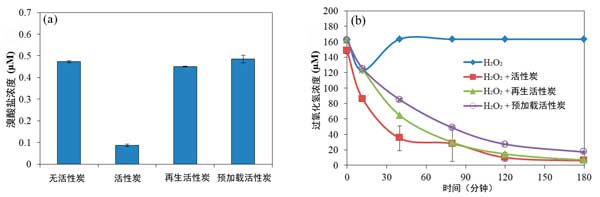 圖2:(a)溴酸鹽和(b)過(guò)氧化氫被不同類(lèi)型的活性炭去除。