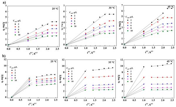 外部和粒子內(nèi)傳質(zhì)過程的分析可以對3,5-二硝基水楊酸的吸附產(chǎn)生顯著影響,在去除3,5-二硝基水楊酸時(shí)可能存在由于物質(zhì)傳輸造成的限制,這有必要對這種現(xiàn)象進(jìn)行分析。圖2a是以外擴(kuò)散模型為基礎(chǔ)構(gòu)建的,從中可以看出,對于活性炭,在吸附過程中接觸長達(dá)6小時(shí)的實(shí)驗(yàn)點(diǎn)處存在一條直線,這表明存在以下可能性,在任何溫度的過程中通過外部傳質(zhì)控制。圖2b顯示了粉末活性炭在3,5-二硝基水楊酸吸附中獲得的實(shí)驗(yàn)數(shù)據(jù)的表示,其中在與吸附劑接觸1小時(shí)時(shí)觀察到一條直線。這表明使用活性炭粒子不存在外部傳質(zhì)問題,因?yàn)?,5-二硝基水楊酸會迅速從溶液中去除,擴(kuò)散到表面。此外,這表明活性炭顆粒中的吸附過程可能是由于表面存在的官能團(tuán)。根據(jù)這些結(jié)果,確定是否也存在內(nèi)部傳質(zhì)問題很重要,從而能夠確定3,5-二硝基水楊酸刪除過程是否受到這種現(xiàn)象的存在的顯著影響。