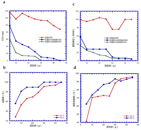 不同活性炭用量在24和54小時(shí)后COD和ADMI的變化如圖2所示。在初始COD濃度為88-136mg/L的情況下,分別通過吸附染料廢水24和52小時(shí)來完全去除COD需要45和30g的活性炭用量(圖2ab)。ADMI的降低和去除趨勢(shì)隨活性炭用量24和52小時(shí)的變化與COD變化相似(圖2)。ADMI隨著活性炭用量的增加而降低。活性炭吸附24小時(shí)和52小時(shí)后,殘留ADMI分別為4-5和5-7。隨著活性炭用量≥30g,ADMI的去除效率從88-96%提高到90-95%。