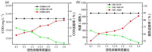 圖1:活性炭載鋁質(zhì)量比對(a)COD和(b)2小時(shí)色度去除的影響。