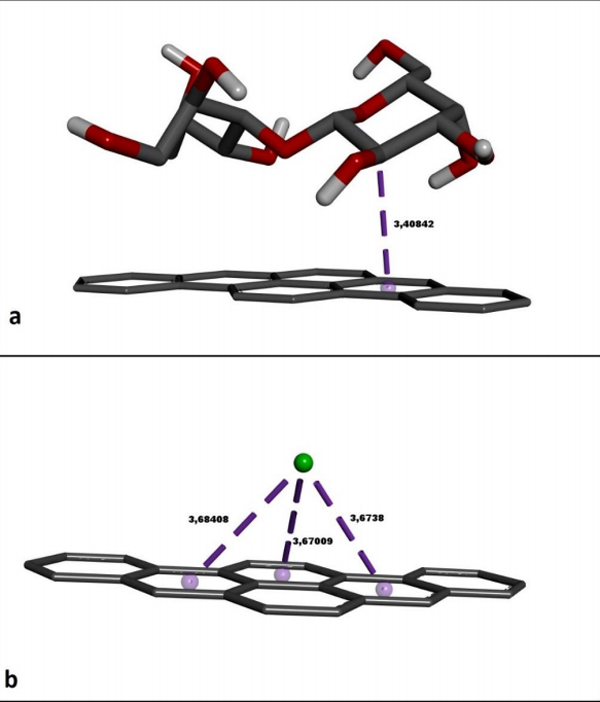 在這項(xiàng)研究中,進(jìn)行了分子對接以檢查活性炭與乳糖以及離子:鈣的原子間相互作用。如圖2a所示,乳糖分子在其結(jié)構(gòu)中的吡喃半乳糖環(huán)的第三個(gè)碳原子上與活性碳的六角碳環(huán)形成一個(gè)疏水π-σ接觸。雖然這種非鍵合接觸的長度為3.40Å,但乳糖與活性炭的結(jié)合自由能是有利的。鈣(Ca+2)離子與三個(gè)相鄰的活性炭六角碳環(huán)形成三個(gè)鍵相互作用(圖2b)。
