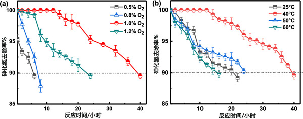 圖2:氧含量(a)和反應(yīng)溫度(b)對(duì)AsH3去除效率的影響。