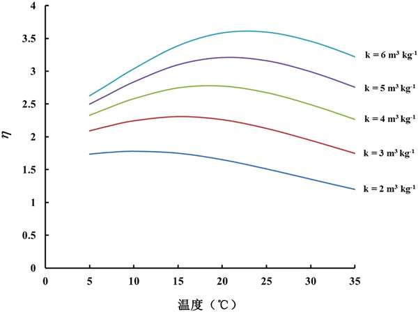 查看活性炭的檢測器的結果(圖2)可以看出,相同溫度下的CF0在活性炭之間存在差異。這意味著不同活性炭的吸附能力存在一些差異。在所有模塊設計中,假設21℃下的吸附容量值為4m3/kg-1。然而,由于我們的實驗結果表明不同活性炭材料的k可能存在差異。不同k值的結果如圖3所示。可以看出,對于區(qū)間2-6m3/kg-1內(nèi)的所有k值,η的變化(例如最大/最小比率)與溫度的變化遠小于未包裝傳感器觀察到的230-305%的變化。