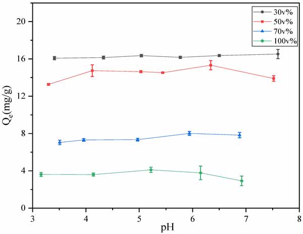 圖1:溶液pH對(duì)鄰苯二甲酸二丁酯吸附能力的影響。本文圖例中的每個(gè)體積分?jǐn)?shù)為乙醇含量。