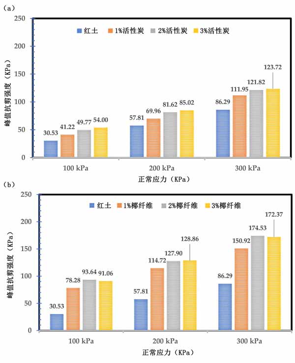 活性炭試樣的剪切強度與剪切應變的關系。峰值剪切強度隨著正應力的增加而提高,特別是300kPa正應力。此外,添加活性炭增加了峰值剪切強度,并且增強率隨著法向應力的增加而增加,如圖4a所示。同樣,添加0.5%的椰殼纖維進一步提高了活性炭穩(wěn)定土的峰值剪切強度,如圖4b所示。雖然在天然紅土中添加活性炭會增加峰值強度,但對于超過2%的活性炭,增加率并不顯著。例如,活性炭穩(wěn)定土的峰值強度分別為2%和3%活性炭的121.8kPa和123.72kPa?傮w而言,與本研究的結(jié)果相似。發(fā)現(xiàn)在石灰穩(wěn)定土壤中使用椰殼纖維可進一步提高抗拉強度和抗壓強度。還觀察到,椰殼纖維的加入提高了膨脹土中的兩個剪切參數(shù)。