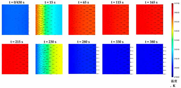 活性炭復(fù)合吸附劑的壓力和溫度決定了平衡吸收,它代表了在給定時間分別在吸附和解吸階段可以達(dá)到的最大和最小吸收容量。然而,顆粒內(nèi)和顆粒間的傳質(zhì)阻力表明吸附材料在每種給定情況下可以多快達(dá)到其平衡吸收能力。這突出了在本研究中同時求解兩種傳質(zhì)機制與其他控制方程的重要性,以顯示促進(jìn)傳熱對傳質(zhì)的凈效應(yīng)。圖2顯示了在430秒循環(huán)時間內(nèi),考慮到預(yù)熱和預(yù)冷階段均為30秒的時間間隔內(nèi)代表性部分的固結(jié)吸附劑域的溫度分布。