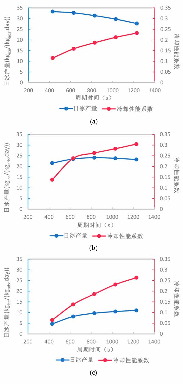 在活性炭厚度為2、5和10mm時,循環(huán)時間的變化對制冰系統(tǒng)的每日制冰量和冷卻性能系數(shù)的凈影響如圖4所示?傮w而言,在給定范圍內(nèi)增加循環(huán)時間可以增加或減少系統(tǒng)的每日制冰量,具體取決于活性炭復(fù)合材料的厚度。然而,無論活性炭復(fù)合材料的厚度如何,系統(tǒng)的冷卻性能系數(shù)通過增加循環(huán)時間而增加。盡管如此,系統(tǒng)冷卻性能系數(shù)在1230的較長循環(huán)時間和5mm活性炭復(fù)合材料厚度下達(dá)到其最大值。通過增加活性炭復(fù)合材料的厚度,日冰產(chǎn)量在不同循環(huán)時間內(nèi)的變化范圍顯著減小,這可以通過比較圖4a-c中給出的每日制冰量范圍看出。這歸因于活性炭復(fù)合材料厚度較厚時有效吸收的減少。