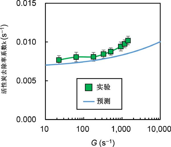我們研究了混合強(qiáng)度對(duì)去除率系數(shù)(k)的影響(圖1)。我們繪制了實(shí)驗(yàn)數(shù)據(jù),實(shí)線顯示了方程式預(yù)測(cè)的值。實(shí)驗(yàn)結(jié)果和預(yù)測(cè)結(jié)果都表明,去除率系數(shù)隨著混合強(qiáng)度的增加而增加,但在G>1000s-1的范圍內(nèi),實(shí)驗(yàn)結(jié)果的增加率變得更陡峭,偏離預(yù)測(cè)的速率系數(shù)值。我們假設(shè)偏差背后的急劇增加是由于活性炭顆粒在高混合強(qiáng)度下的分解(在給炭時(shí)輕度聚集)。這些預(yù)測(cè)是在假設(shè)活性炭顆粒的尺寸(部分聚集在原料懸浮液中)在給炭后保持不變的情況下做出的,因?yàn)樵活w粒尺寸測(cè)量是不可能的。如果這個(gè)假設(shè)是正確的,那么去除率系數(shù)隨著混合強(qiáng)度的急劇增加,在高G對(duì)于在給炭時(shí)已經(jīng)處于分散狀態(tài)的活性炭顆粒,不應(yīng)觀察到-值范圍。為了驗(yàn)證這一假設(shè),我們使用了非聚集活性炭,其粒徑在分散處理前后沒有變化,我們?cè)诓煌幕旌蠌?qiáng)度。我們沒有觀察到隨著活性炭混合強(qiáng)度的增加,去除率系數(shù)的急劇增加,強(qiáng)烈表明觀察到的活性炭的急劇增加是由于高混合條件下的顆粒分解。