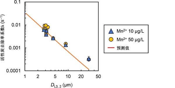 二價(jià)錳離子(Mn2+)在配水系統(tǒng)中被氧化成黑色氧化錳,是飲用水中出現(xiàn)美觀問題的主要原因。為了去除可溶性二價(jià)錳我們研究了游離氯催化氧化去除活性炭表面上的二價(jià)錳,并發(fā)現(xiàn)當(dāng)使用微米級(jí)活性炭時(shí)效果比較好。在此,我們新推導(dǎo)出了催化反應(yīng)去除痕量物質(zhì)的動(dòng)力學(xué)模型,并將其應(yīng)用于二價(jià)錳去除。