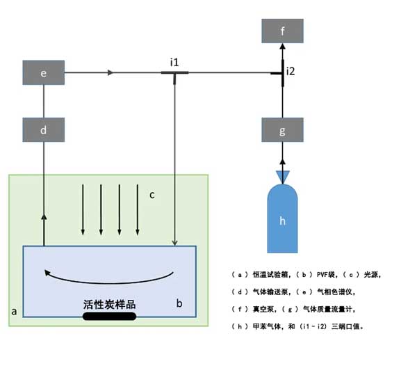 系統(tǒng)研究了活性炭復(fù)合材料的光催化性能。為了模擬實(shí)際應(yīng)用,在恒溫試驗(yàn)箱中將不銹鋼罐替換為60L聚氟乙烯袋,并保持恒溫(例如20℃)。然后,將3g活性炭微粒放在盤子上并放入袋中。入射光可以穿過PVF薄膜到達(dá)活性炭表面。其結(jié)構(gòu)如圖1所示。為了測(cè)試光催化活性,反應(yīng)器首先用泵抽真空。然后,注入60L甲苯氣體(空氣中50.0ppm)作為目標(biāo)室內(nèi)污染物。這需要大約12分鐘。之后,將反應(yīng)器在黑暗中保持0.5小時(shí)以達(dá)到吸附/脫附平衡。使用300W氙氣燈作為模擬日光源。使用氣相色譜儀定期分析反應(yīng)器中的氣體產(chǎn)物。此外,口袋中的甲苯氣體還不能完全流到氣相色譜儀的自動(dòng)氣體進(jìn)樣閥,因?yàn)樵撻y的管徑比較小,輸氣泵剛剛啟動(dòng)。因此,甲苯濃度低。