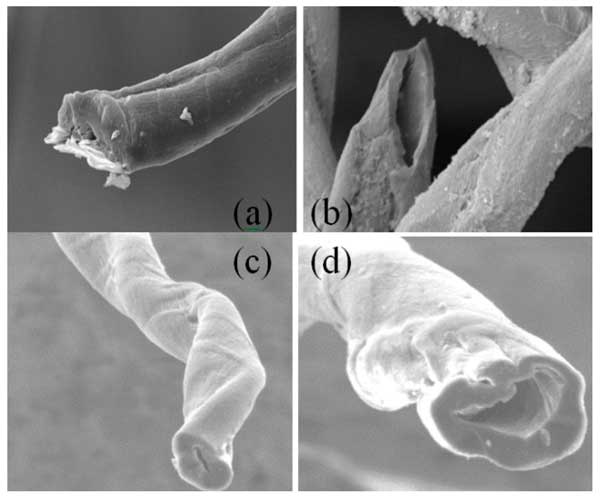 通過煅燒和HNO3、H2O2和KOH活化,廢棉纖維成功轉(zhuǎn)化為不同結(jié)構(gòu)的活性炭。圖1顯示了三種活性炭的SEM圖像。可以看出,化學(xué)活化有助于大孔隙的形成。在整個(gè)纖維長(zhǎng)度上可以觀察到一個(gè)空心芯,直徑約為0.5–5.0µM,形狀幾乎為圓形;钚蕴烤哂懈叨榷嗫椎慕Y(jié)構(gòu),核心直徑在大約0.5和5μM之間(圖1b,d)。這種大孔隙率可能與纖維內(nèi)壁木質(zhì)素的化學(xué)破壞有關(guān)。參考活性炭(圖1a)呈現(xiàn)大孔隙,而形態(tài)特征是纖維中芯的出現(xiàn),其直徑取決于活化劑。使用過氧化氫作為活化試劑獲得最大直徑(圖1b)。如圖1b-d所示,前體的結(jié)構(gòu)(最初具有干凈的表面)在每次化學(xué)處理后都會(huì)被破壞。有趣的是,其中一種活性炭的表面在化學(xué)活化的影響下發(fā)生明顯變化(與其他活性炭相比)。