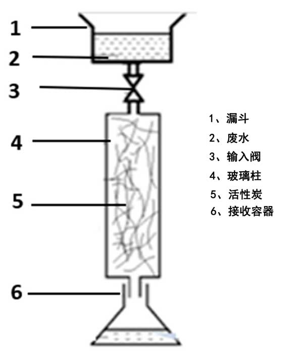 通過在密封玻璃瓶中將已知量(4.0g)的活性炭與50mL實(shí)際廢水樣品進(jìn)行反應(yīng),進(jìn)行批量吸附平衡實(shí)驗(yàn)。測(cè)試了具有不同初始硫濃度(100、300、500、800和1000mg·L-1)的五個(gè)樣品。將瓶子在恒溫?fù)u床上放置24小時(shí),直至達(dá)到平衡(最終pH值:10.5)。用于床吸附實(shí)驗(yàn)的裝置的示意圖如圖2所示。將碳化纖維填充到玻璃柱中以研究它們的吸附能力。廢水被引入漏斗并通過輸入閥以將流量調(diào)節(jié)為4–5.10m3·h-1。首先,使用流經(jīng)柱的蒸餾水潤(rùn)濕床吸附裝置以改善活性炭纖維的潤(rùn)濕特性。其次,允許漏斗中的煉油廠廢水樣品內(nèi)容物通過活性炭床通過重力排放到接收容器。每小時(shí)回收處理過的水。