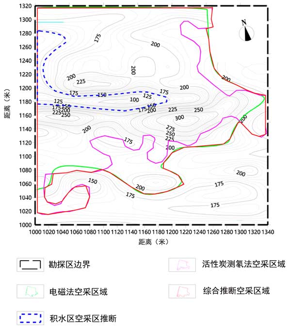 電磁法集探測(cè)深度大、分辨率高、能夠識(shí)別采空區(qū)積水狀態(tài)等優(yōu)點(diǎn)于一體。但是,它很容易受到靜電效應(yīng)和近場(chǎng)效應(yīng)的影響。發(fā)射端附近的導(dǎo)體可能會(huì)對(duì)發(fā)射源產(chǎn)生干擾,在地形地貌、工作環(huán)境復(fù)雜的地區(qū)極易影響測(cè)量精度。然而,用于氡測(cè)量的活性炭方法不受地形、地電或EMF的影響。然而,這種方法無法解釋采空區(qū)深度。因此,這兩種方法可以相互借鑒,彌補(bǔ)各自的不足。