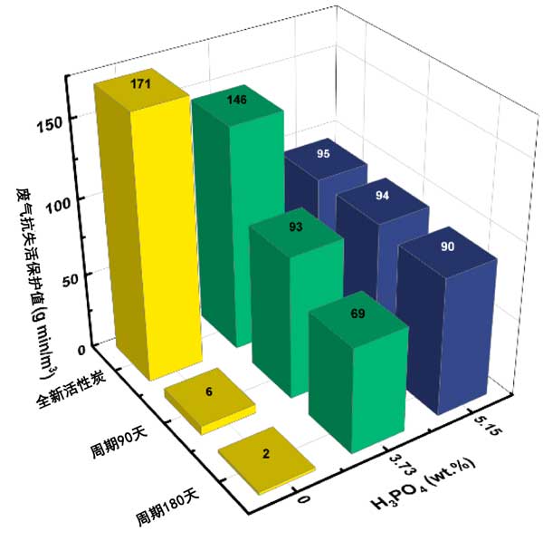 在實(shí)驗(yàn)條件下活性炭加速失活3個(gè)月和6個(gè)月,對(duì)比常態(tài)下的改性活性炭對(duì)抗廢氣的效果分別降低了59-89%和>75%。磷酸鹽的添加抑制了活性炭的失活,失活3-6個(gè)月后防護(hù)值僅下降17~23%和32~37%。一般來說,與正常情況相比,保護(hù)后的活性炭可以提高吸附時(shí)長。其原因是失活后,特別是在沒有添加劑的活性炭中,浸漬金屬的化學(xué)吸附能力非常低。因此,廢氣的吸附主要通過物理吸附發(fā)生。干燥去除了占據(jù)物理吸附位點(diǎn)的水,從而能夠通過物理吸附吸附一定量的廢氣。實(shí)際上,即使活性炭失活并超過其預(yù)期保質(zhì)期,其保護(hù)能力也可能通過干燥而部分恢復(fù)。