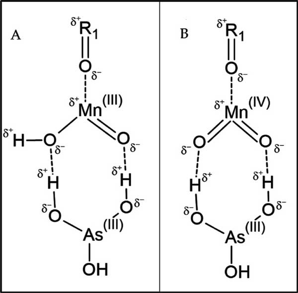 圖4:(A)顯示反應(yīng)(1)的產(chǎn)物,其中MnO被氧化為MnOOH。(B)顯示反應(yīng)(2)的產(chǎn)物,其中MnO被氧化成MnO2。As(III)通過氫鍵物理吸附到負(fù)載Mn的表面。