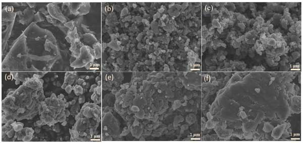 圖1:(a)活性炭、(b)研磨12小時(shí)、(c)研磨24小時(shí)、(d)研磨48小時(shí)、(e)研磨60小時(shí)和(f)研磨72小時(shí)的SEM圖像。