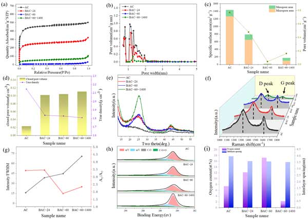 圖2:球磨活性炭的結(jié)構(gòu)表征。(a)N2吸附-脫附等溫線;(b)孔徑分布;(c)比表面積和孔體積;(d)閉孔體積和真密度;(e)XRD圖譜;(f)拉曼光譜;(g)樣品拉曼光譜的XRD(002)峰強(qiáng)度的變化;(h)XPSC1s譜;(i)氧含量和層間距。