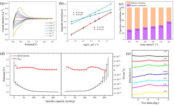 為了研究球磨活性炭電極的鈉存儲機(jī)制,在半電池中以不同的掃描速率進(jìn)行CV測試。圖4a顯示了熱處理后活性炭研磨60小時(shí)在不同掃描速率下的CV測量,以評估速率行為。在較高的掃描速率下,CV曲線偏離標(biāo)準(zhǔn)位置,表明極化和歐姆電阻增加。方程i=avb用于探索測量電流(i)和掃描速率(v)之間的相關(guān)性,有助于確定擴(kuò)散和電容對電化學(xué)行為的貢獻(xiàn)。b的值表示主導(dǎo)過程(值接近1時(shí)為表面控制,值約為0.5時(shí)為擴(kuò)散控制),由log(v)-log(i)圖的斜率得出。如圖4b所示,該圖說明了峰值P/P'和S/S'的log(i)與log(v)圖和擬合結(jié)果,以及P/P'和S/S'的計(jì)算b值峰值分別為0.40/0.67和0.78/0.72。這表明GCD曲線中低于0.2V的平臺區(qū)域(對應(yīng)于CV中的P/P'峰值范圍)與閉孔中鈉的緩慢填充有關(guān)。相反,GCD曲線的高電位傾斜區(qū)域與石墨納米域中石墨烯夾層的鈉提取/插入有關(guān)。在0.2mVs-1的掃描速率下,CV曲線顯示電容容量占總?cè)萘康?2%,而在2mVs-1下,電容過程主要控制電化學(xué)行為。