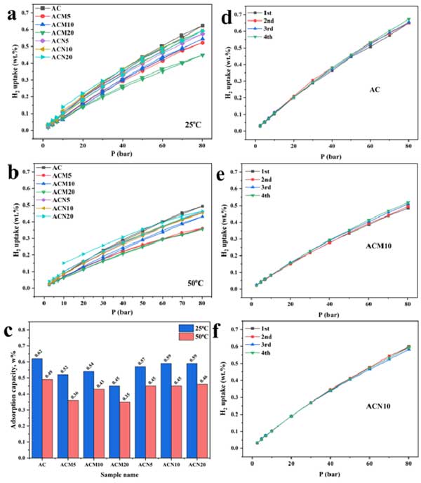 在25℃和50℃兩個溫度下,測定各樣本在0–80bar下的氫氣吸附–脫附等溫線,并從中提取最大吸附量。主要結(jié)果如下: