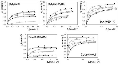 得到的結(jié)果表明,活性炭的不同的吸附能力與IL的性質(zhì)和溶液中的鹽量有關(guān)。一般而言,對于咪唑鎓的ILs,陰離子對其對活性炭的吸附能力的影響按照以下順序:Cl - ≈[CH 3 SO] <[CF 3 SO 3 ] -<[NTf 2 ] 。這一趨勢的結(jié)果和預計的相符合,并且表明,隨著陰離子疏水性的增加,活性炭對ILs的吸附逐漸增加。另一方面,考慮到IL陽離子家族,活性炭能吸附更多的吡啶鎓比基于咪唑類的對應(yīng)物?傊,這里證明,如果伴隨使用無機鹽來促進鹽析現(xiàn)象并增強隔離度,則活性炭也可以用作水介質(zhì)中低濃度存在的親水性IL的有效吸附劑。得到的結(jié)果表明, 在鹽的存在下,親水性ILs的例如[C 4 C 1 im] Cl和[C 4 C 1 im] [CH 3 SO3 ]的K d值增加高達5.5倍。這種新方法可以被設(shè)想為減少由使用IL的工業(yè)過程產(chǎn)生的含水物流污染的有希望的途徑。