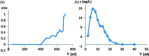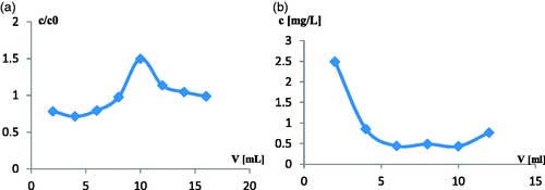 圖2.(a)氧化活性炭上銨離子(NH4+)的SPE(c/c0=f(V))過程中的穿透曲線。(mcar=0.104g ,離子濃度c=NH4+- = 0.661mg/L)。指定每5ml濾液的比例c/c0。(b)經(jīng)過SPE柱分析每2ml洗脫液后,來自經(jīng)氧化的活性炭的銨離子解吸曲線(c= f(V))。
