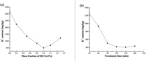 圖1。氯化氫溶液的質(zhì)量分?jǐn)?shù)和處理時(shí)間對(duì)活性炭的鉀離子含量的影響。