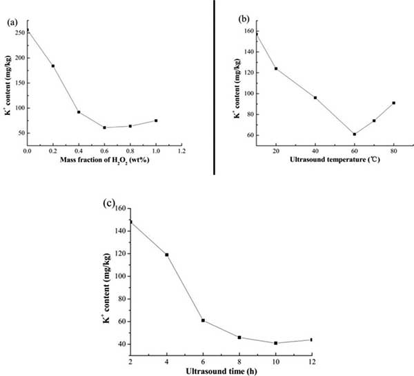 然后對(duì)活性炭(AC-WH 1%/ 120min)進(jìn)行氧化 - 超聲處理以深度除去鉀離子。研究了H2O2溶液的質(zhì)量分?jǐn)?shù),超聲溫度和超聲時(shí)間對(duì)活性炭中鉀離子含量的影響。得到的結(jié)果和圖2所示。H2O2溶液的質(zhì)量分?jǐn)?shù)在超聲時(shí)間6小時(shí)和超聲溫度60℃下在0-1.0重量%的范圍內(nèi)。表明不含H2O2的活性炭的鉀離子含量處理量為256 mg / kg,大大低于活性炭(AC-WH 1%/ 120min)和417 mg / kg,這與超聲波作用能夠加速固體間的液體傳質(zhì)過(guò)程,促使交流孔內(nèi)的一些非碳化物質(zhì)與鉀離子一起分散到溶液中。從圖2(a)可以看出,活性炭的鉀離子含量從256顯著降低到61 mg / kg,此后當(dāng)H2O2溶液的質(zhì)量分?jǐn)?shù)從0增加到0.6 wt%時(shí),基本保持不變。。因此,可以說(shuō)H2O2處理對(duì)生產(chǎn)低鉀離子含量的活性炭有很大的影響。一方面,作為氧化劑,H2O2溶液可以減小鉀離子和活性炭孔壁之間的作用力,使其容易轉(zhuǎn)移到溶液中。另一方面,活性炭中的鉀離子可以與一些有機(jī)基團(tuán)以化學(xué)鍵的形式共存,這些有機(jī)基團(tuán)可以通過(guò)H2O2溶液的存在而被破壞,使得可以有效的去除活性炭中的鉀離子。