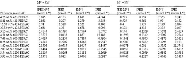 為了進一步闡明聚乙烯亞胺浸漬量對活性炭上金屬離子平衡吸附容量的影響,本文計算和比較了PEI浸漬AC上重金屬離子吸附的相互作用參數(shù)(表示為PEI)。應(yīng)該指出的是,I PEI不等于絡(luò)合常數(shù),只計算比較重金屬和PEI浸漬的活性炭表面之間的相互作用程度。