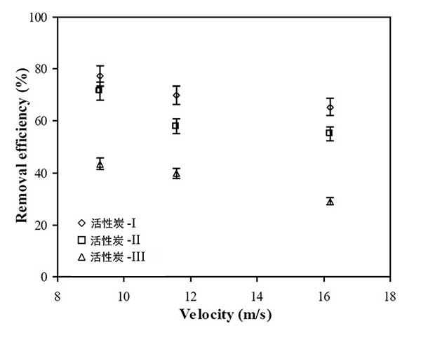 流速同時(shí)影響氣體吸附和活性炭回收,因?yàn)樗婕皻怏w和活性炭顆粒的混合程度、。圖3在各種活性炭吸附劑尺寸下,氣體去除效率和流量之間呈現(xiàn)出輕微的反比關(guān)系。最小的吸附劑(活性炭-1)以9.26米/秒除去77.4%的甲苯蒸氣,然后以16.2米/秒降至65.4%。微;钚蕴课絼┎东@沿著旋風(fēng)分離器的流動(dòng)路徑行進(jìn)的甲苯蒸氣。雖然在前面的的內(nèi)容說過吸附量以高速增加,但是氣體去除效率相當(dāng)?shù)汀_@是因?yàn)樵诟吡髁肯录妆降慕^對(duì)體積要高得多。因此,即使活性炭吸附得更多,更多的氣體分子傾向于流出而沒有在內(nèi)部吸收。因此,關(guān)于顆粒回收和氣體去除效率的最佳流量必須通過在各種操作條件下的眾多實(shí)驗(yàn)來確定。