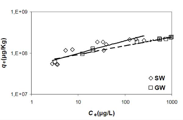 這次實驗?zāi)康氖潜容^淡水和鹽水中活性炭去除菲的結(jié)果,因此不考慮來自水中其他有機化合物的競爭(使用3.72的表面/孔擴散流量比值,典型值為蒸餾水)。該通量比反映了與活性炭的內(nèi)孔相比,目標化合物在活性炭顆粒的表面空隙中擴散的情況。當目標化合物在其他競爭化合物或天然有機物質(zhì)的存在下被吸附時,將使用較低的值(例如0.4)。介紹了菲和活性炭在淡水和鹽水合成溶液中的吸附等溫線。兩個等溫線都是非線性的。Freundlich模型符合數(shù)據(jù),但它不是鹽水等溫線的最佳模型。它用于目前的工作中,以便將結(jié)果與之前的研究進行比較,并且為了使用用于活性炭床模型的Freundlich常數(shù)。在圖1中,鹽濃度增加接近水溶性的菲的吸附(在Ce =180μg/ L時,qe從1.9E + 8增加到2.2E + 8; + 15%),但是這種增加隨著菲濃度的降低而降低。在菲濃度約10μg/ L以下時,當溶液中存在鹽時,吸附減少(qe從6.0E + 7降至5.4E + 7; - 10%)。對于淡水實驗,Vo計算的中孔體積的47%被測量為470-490cm3 / kg ;贔reundlich模型,Kfr表示為每孔活性炭孔體積的菲吸附量等于52%。
