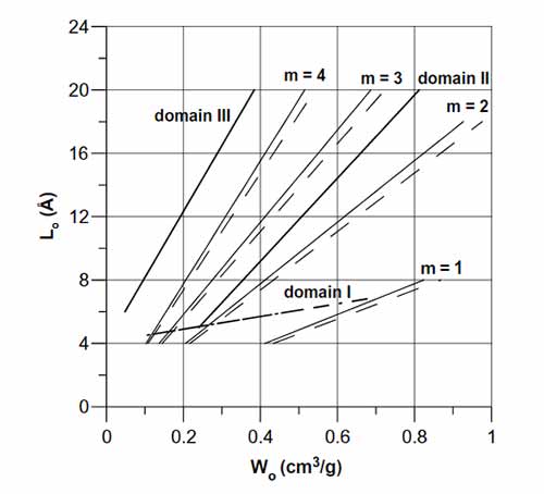 活性炭孔隙率遵循三個(gè)線性結(jié)構(gòu)域所示的常見(jiàn)趨勢(shì)。這一事實(shí)表明存在著由不同前體和精制路線的固體部分共同形成的共同形態(tài)。根據(jù)這些多孔固體的近期和各種已發(fā)表的特征,它們的孔壁由基本結(jié)構(gòu)單元的空間排列構(gòu)成,所述基本結(jié)構(gòu)單元由層疊的石墨烯層組成。為了減少模型中的參數(shù)數(shù)量,結(jié)構(gòu)被描述為圓盤狀顆粒,其直徑的特征在于石墨烯層中涉及的苯環(huán)的數(shù)量,并且其厚度由堆疊層的數(shù)量和層間距離。用于工業(yè)宏觀尺寸盤狀顆粒堆積的可用經(jīng)驗(yàn)相關(guān)性已經(jīng)應(yīng)用于那些納米級(jí)結(jié)構(gòu),導(dǎo)致在chars和碳分子篩觀察到的實(shí)驗(yàn)微孔體積范圍內(nèi)的值。