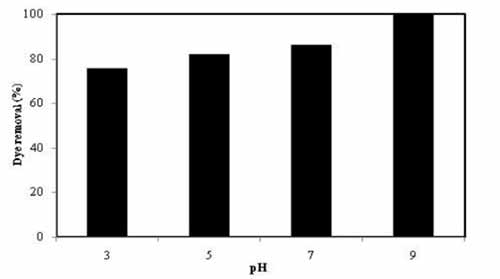 圖2:pH對(duì)活性炭吸附甲基紫的影響(條件:初始濃度=100mg L-1,接觸時(shí)間=120 min,活性炭劑量=0.6g L-1)。