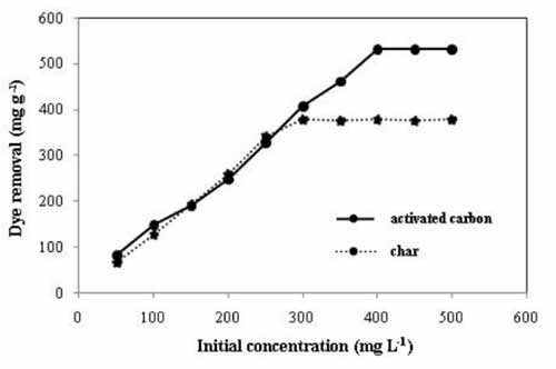 圖4:初始濃度對(duì)活性炭吸附甲基紫影響(條件:pH=9,接觸時(shí)間=90分鐘,活性炭劑量=0.6g L-1)。