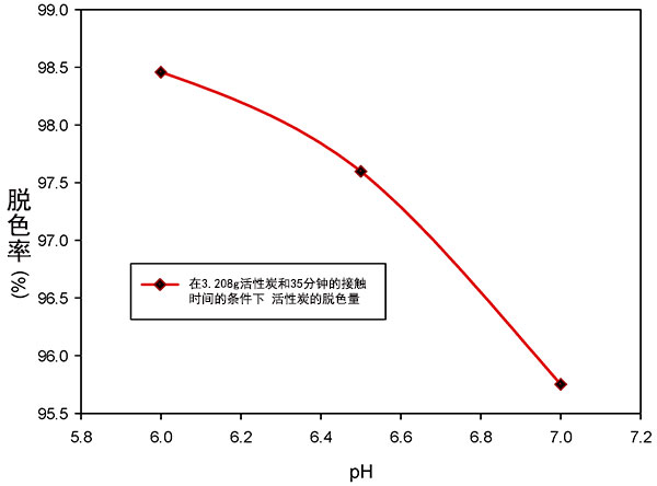 實(shí)驗(yàn)過(guò)程中發(fā)現(xiàn),活性炭在較低的pH環(huán)境對(duì)顏色吸附效果得到大幅度增強(qiáng)。盡管如此,排放處理的酸性廢水的影響可能直接阻礙水生棲息地。鑒于此,使用預(yù)處理的活性炭吸附研究在6至7的可接受的pH范圍內(nèi)進(jìn)行?紤]的另外兩個(gè)因素是劑量和接觸時(shí)間,并且它們分別保持在3.208g和35min。從圖3中可以看出可以觀察到,顏色去除的百分比隨著pH的降低而增加。在pH6時(shí)獲得最高的顏色去除率98.46%,但隨著pH增加到7,顏色去除率降低到95.69%。