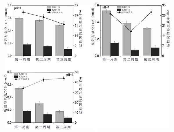 pH的變化導(dǎo)致活性炭表面電荷的變化并影響吸附性能。如在呈現(xiàn)圖1,吸附/再生循環(huán),不同的pH條件下進(jìn)行三次。圖1的左Y軸表示在吸附/再生循環(huán)期間吸附或氧化的TCE量,圖1的右Y軸表示吸附/再生循環(huán)期間TCE的再生效率。在再生期間TCE最終被氧化成氯化物(1mol TCE最終可以產(chǎn)生3mol氯化物),這意味著氯化物可以代表TCE的氧化量。產(chǎn)生的氯化物除以3是氧化的TCE量。在第一次再生循環(huán)期間,在3,7和9的不同pH條件下,30.22%,29.29%和33.98%的TCE被礦化成氯化物(圖1)。然而,在第二次和第三次再生循環(huán)期間,當(dāng)pH為3時(shí),活性炭的再生效率降低至26.75%和21.87%。由于pH值為7和9時(shí)TCE吸附減少(圖1),當(dāng)pH為9時(shí),活性炭的再生效率提高到42.52%和44.01%,降至17.04%,然后在pH值為7時(shí)提高到30.41%。