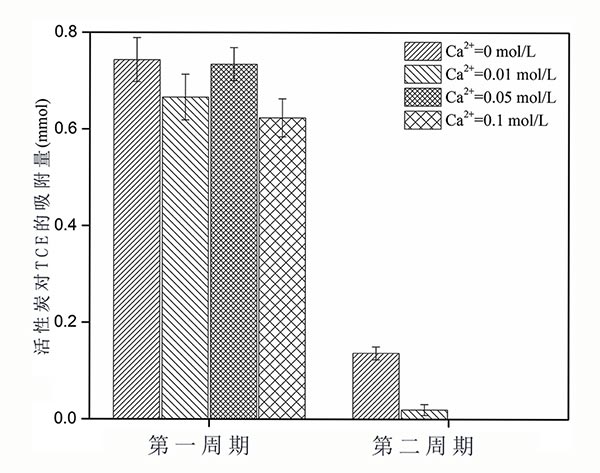 如圖2所示,進(jìn)行了兩次吸附/再生循環(huán)。在第一次吸附/再生循環(huán)期間,當(dāng)鈣離子存在時(shí),TCE去除明顯減少。顯然,在第二次吸附/再生循環(huán)期間,即使進(jìn)行活性炭的再生,也難以在鈣離子條件下除去TCE。這表明鈣離子不僅在活性炭的吸附能力,而且在其再生過程中都起著重要作用。原因可能是由于鈣離子與其他離子的結(jié)合,導(dǎo)致其容易在活性炭表面上沉淀并影響其吸附能力,導(dǎo)致第二循環(huán)中TCE去除的減少。
