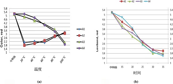圖2:(a)溫度和時(shí)間(b)對(duì)漂白過程的影響。