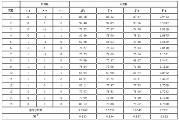 圖1示出了一組測定的實驗條件(表示為編碼變量)和因變量所獲得的實驗數(shù)據(jù)y1-y4,以及有關(guān)廢水的顏色化合物的參數(shù),與活性炭處理前的參數(shù)。