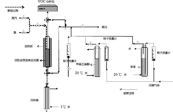 在稱重后將活性炭重新安裝到反應(yīng)器中。然后將閥門切換到解吸過程。將冷卻器的溫度設(shè)定為5℃,并加熱加熱帶直至達(dá)到解吸介質(zhì)的所需溫度(100℃或130℃)。解吸時(shí)間為10分鐘。當(dāng)反應(yīng)器的中心達(dá)到約35℃時(shí),將解吸介質(zhì)引入反應(yīng)器中。然后收集解吸的溶劑。當(dāng)滿足設(shè)定的解吸時(shí)間時(shí),終止加熱和解吸介質(zhì)并且溫度開始下降。此后,將吹掃的壓縮空氣注入(在某些實(shí)驗(yàn)測(cè)試中使用氮?dú)?到反應(yīng)器中,直到中心溫度降至室溫。收集解吸的溶劑并稱重用于計(jì)算活性炭的工作容量。工作容量定義為吹掃后飽和VOC吸附容量與碳上殘余VOC的差值。然后使用氣相色譜儀分析溶劑的組成。